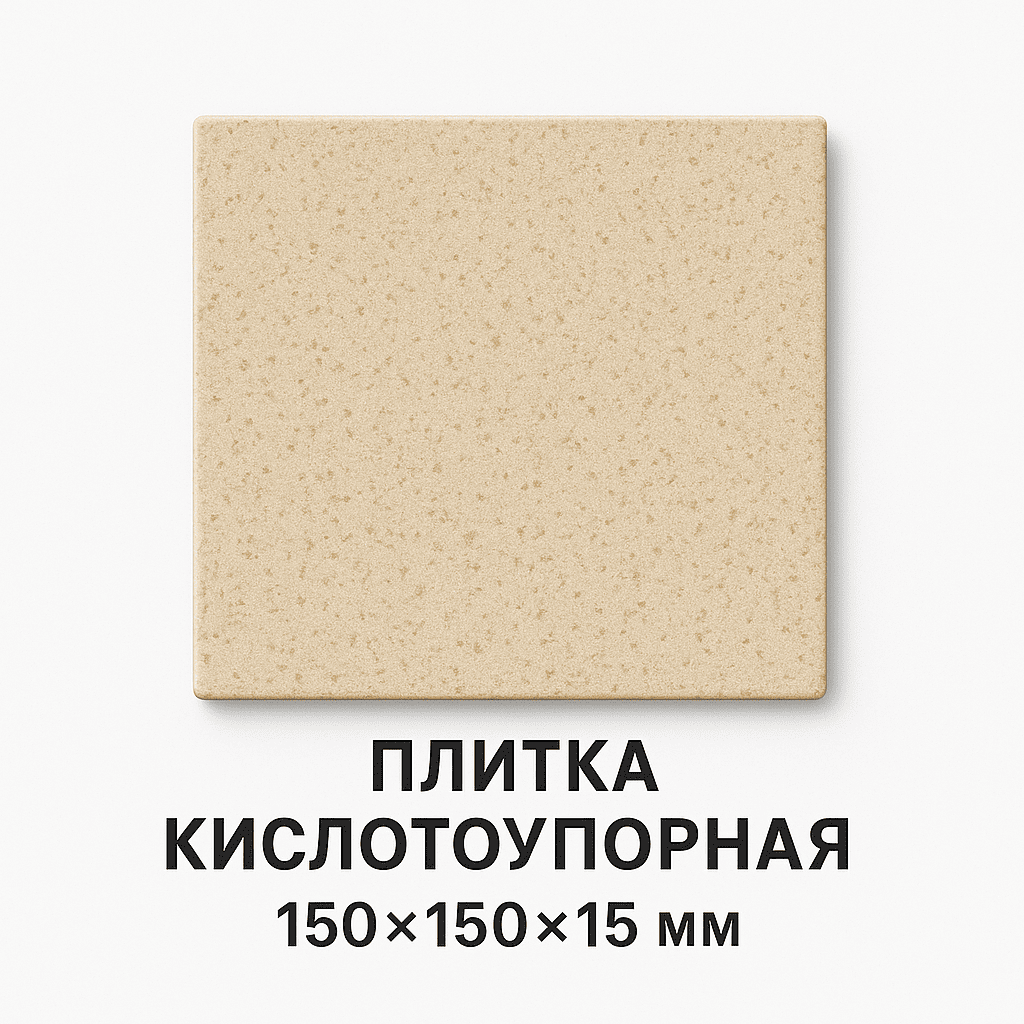 Плитка кислотоупорная 150×150×15 мм устойчива к серной и соляной кислотам с кислотоупорностью 96-98%. Прочность на сжатие достигает 15-25 МПа, водопоглощение – 6-12%. Размер 150×150×15 мм и вес около 1 кг облегчают транспортировку. Низкая теплопроводность (0,8-1,2 Вт/(м·К)) позволяет применять при 1000°C.